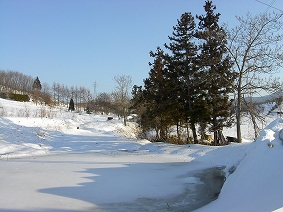 < 冬のアップルロード > 平成22年2月23日 秋には鈴なりのりんごを見られる アップルロードも、冬は一面雪 景色です。2月下旬になると道路 の雪はだいぶなくなりますが、路肩 にはまだ1m程積もっています。 アップルロードのメインストリート から脇道に入ると、違った景色が 楽しめます。 凍った沼と並木のコントラストは ちょっと異国のように見えませんか? |
