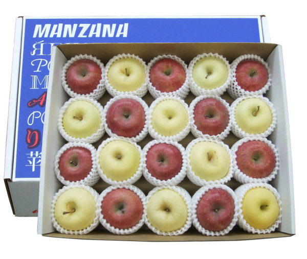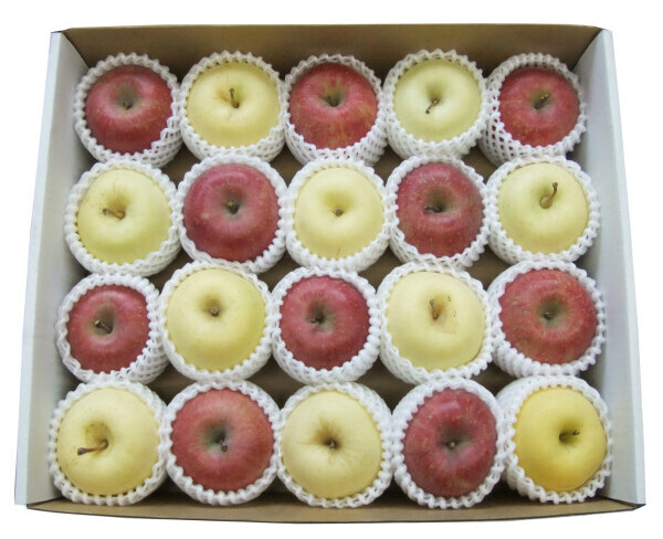 写真の詰合せは「金星+サンふじ」で、紅白の市松模様をつくり晴れやかに仕上げてみました。